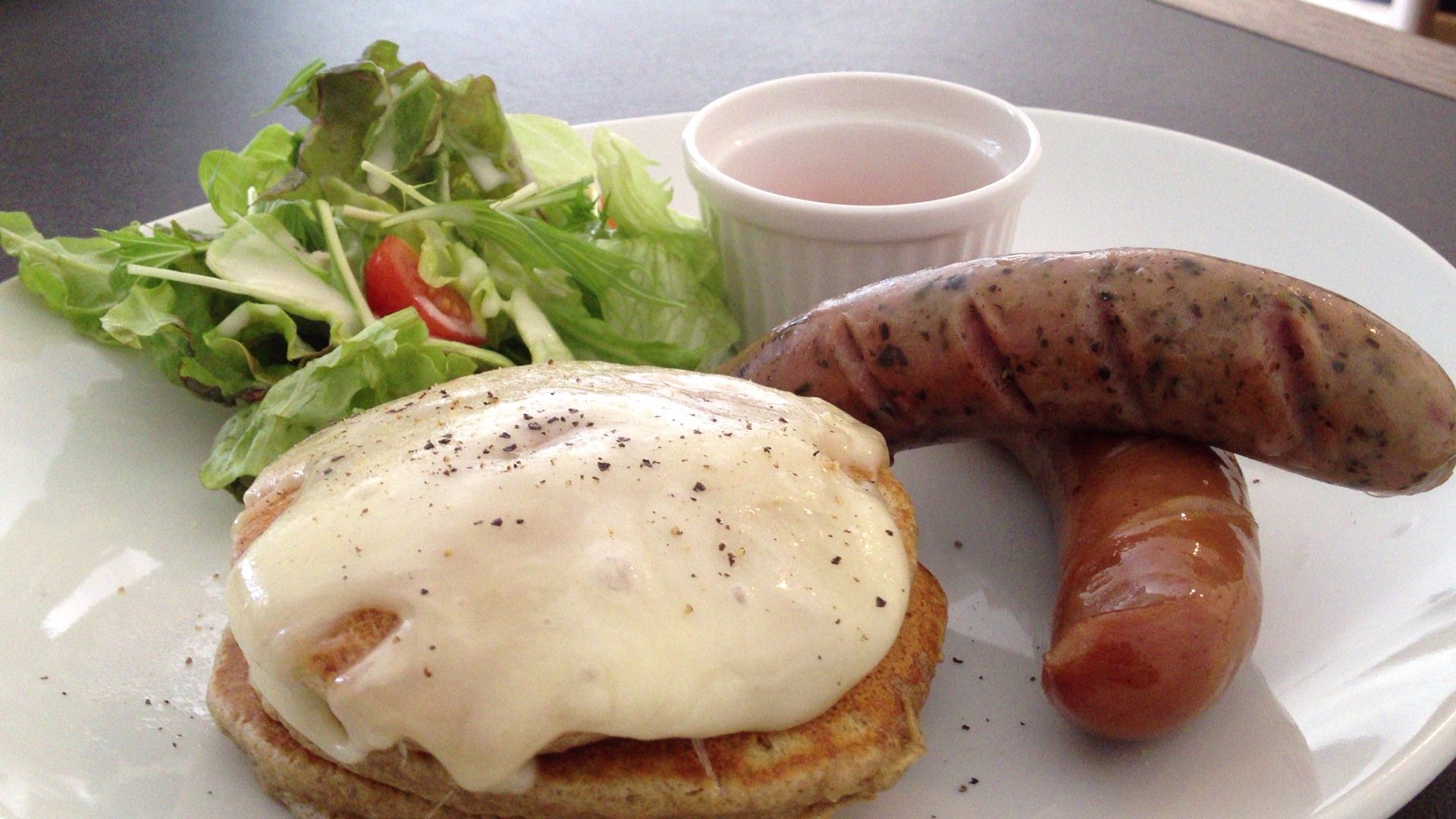 ごはんパンケーキとでもいうのか、甘くないスタイルのパンケーキを出してくれます。
