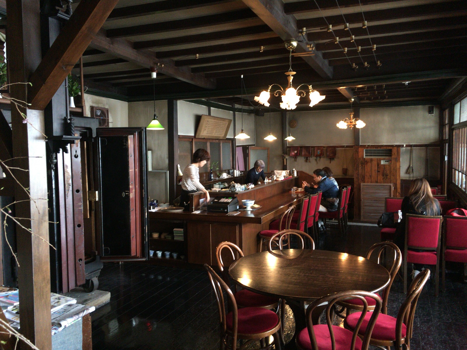 黒光りする床とアンティークな椅子や照明。