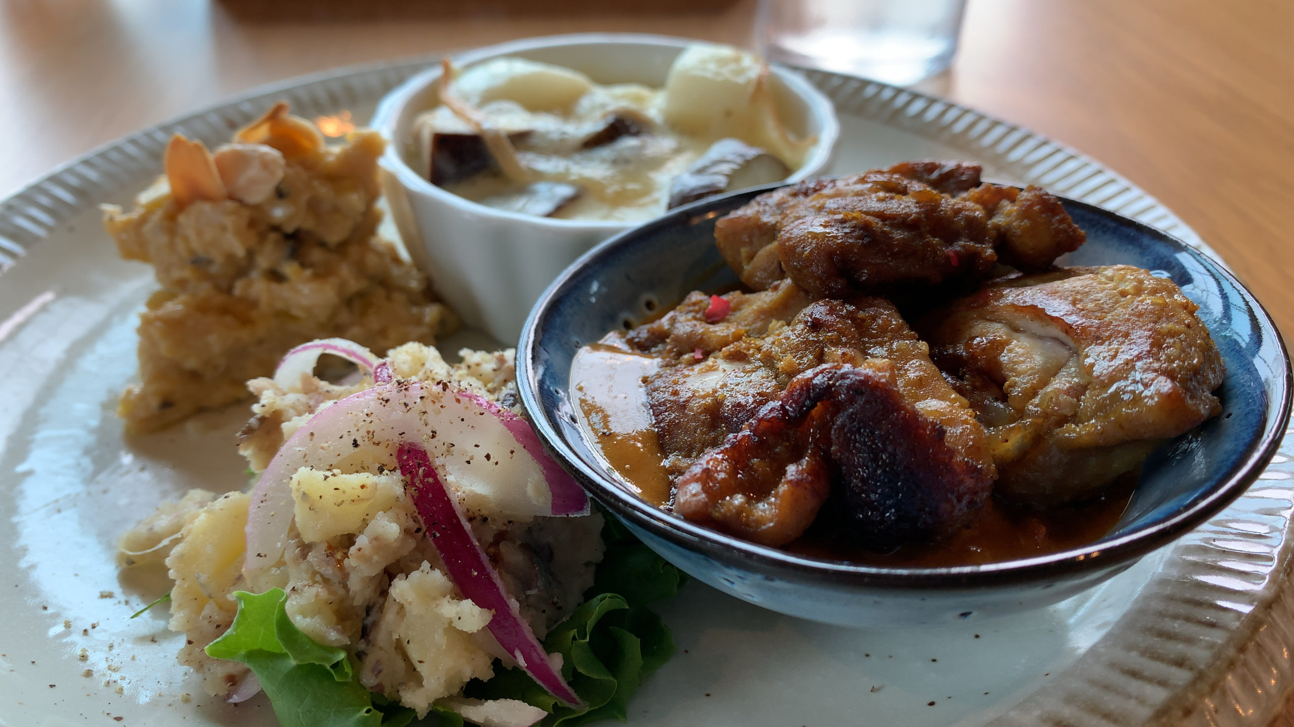 Grilled chicken with curry, anchovy potato salad, eggplant and yam gratin, and more.