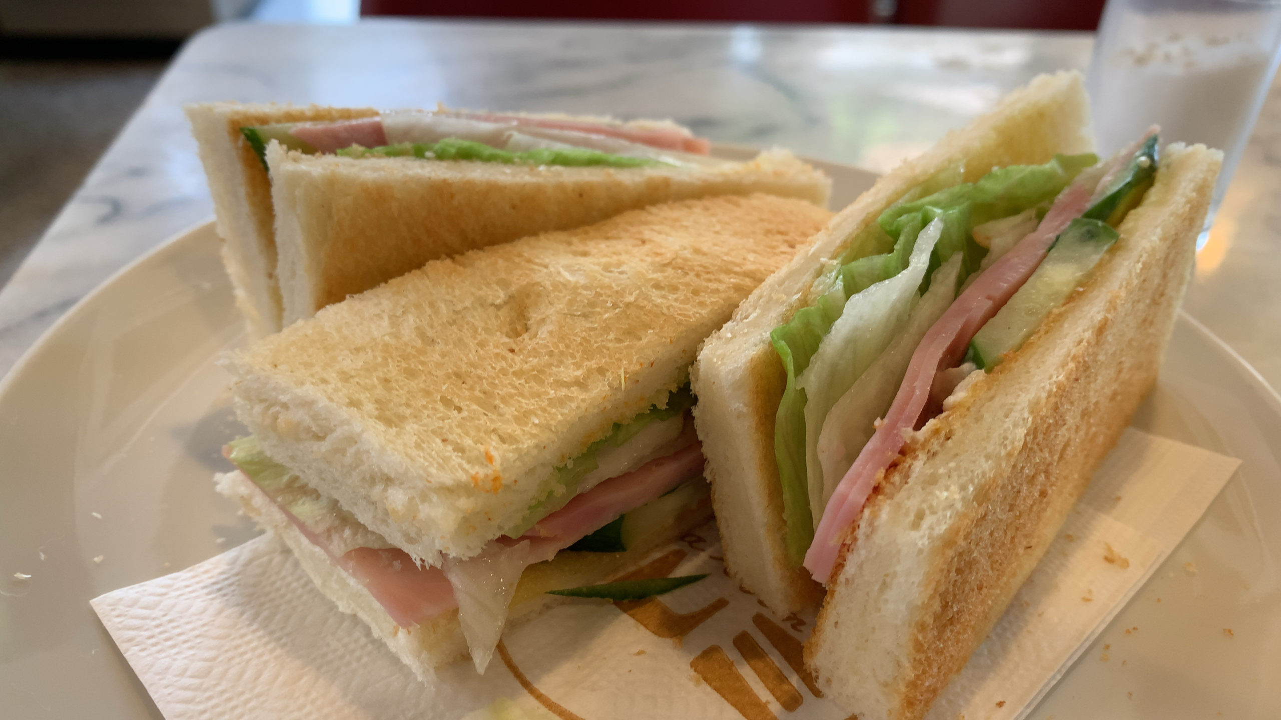 薄っぺらいトーストでハムとレタスをサンド。