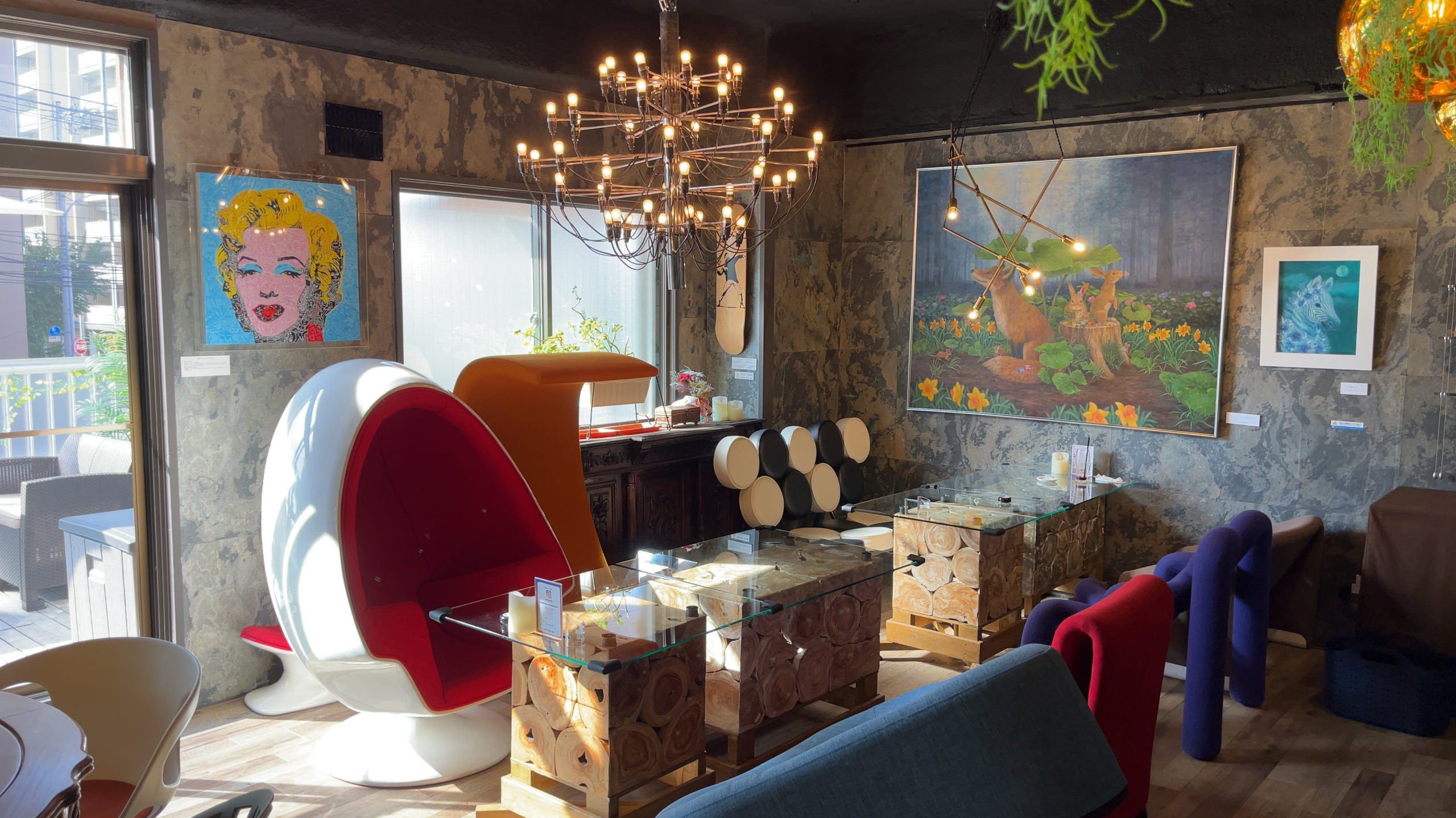 店内の造りは面白く、モダンアートエリア、アンティークエリア、屋外テラスのリゾートテラスエリアの3つのエリア区分を設け、非日常的な時間と空間を提供している。