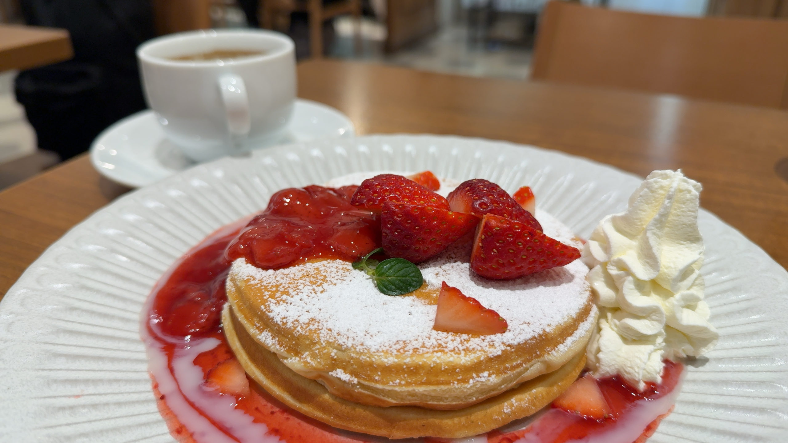 1回目は「たっぷりいちごと練乳の”こく甘”パンケーキ(1200円)」と「よつ葉の白いパフェ(900円)」を注文。