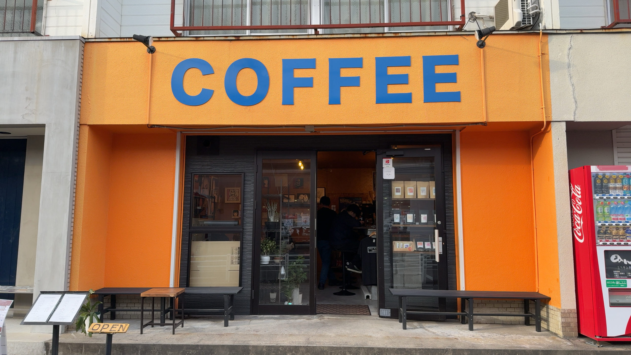 佐賀駅北口側。バスターミナルの向かい。オレンジに青文字で「COFFEE」と書かれた店構えが印象的。