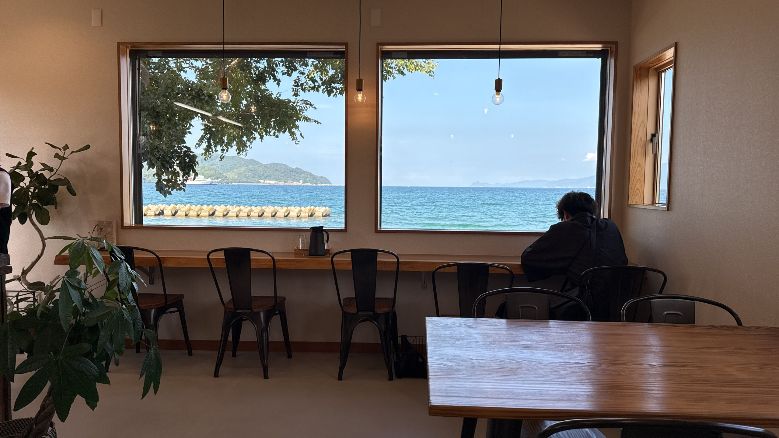 冷房の効いた涼しい店内から海辺の借景を楽しむ。